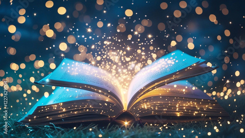 Open magical book with glowing pages, magical sparkle, bokeh lights effect and dark background. ethereal atmosphere, knowledge illumination. Generative AI