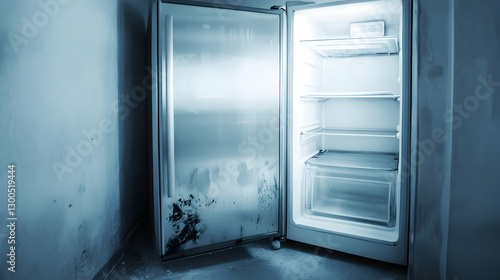 Open Metallic Fridge Interior with Empty Shelves Illuminated in a Clean Modern Kitchen Environment
