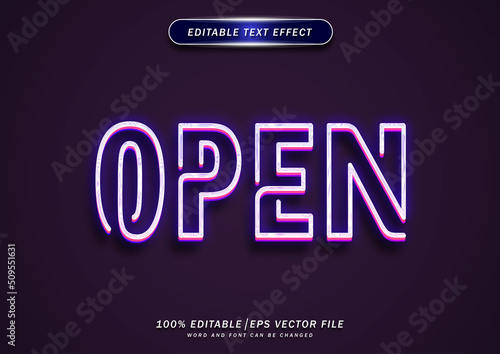 Open neon text effect. 3d blue neon cartoon vector design.