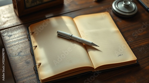 Open Notebook and White Pen on Rustic Wooden Background - High-Resolution Stock Photo
