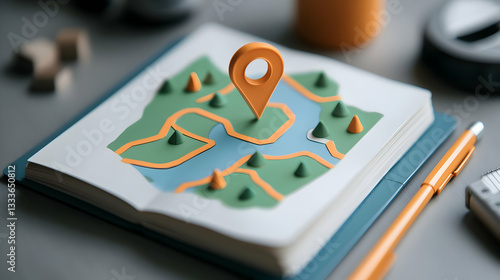 Open Notebook with 3D Map Illustration and Orange Location Pin