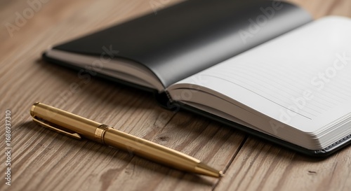 Open notebook with blank pages and golden pen on a wooden desk, ready for writing