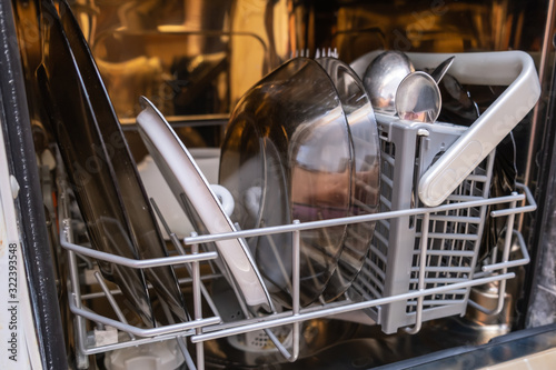 Open overloaded dishwasher with different dishes and kitchen utensils