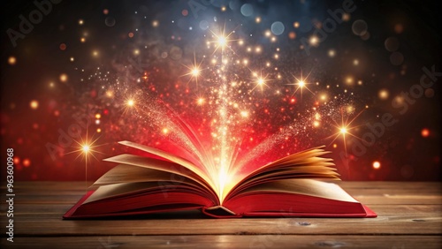 Open red book with magical glowing lights shining from its pages