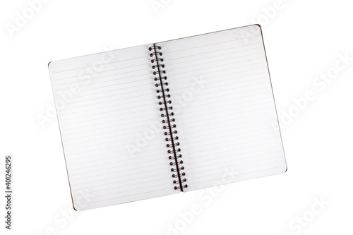 Open spiral notebook with blank sheets on a white background. View from above. Copy space.