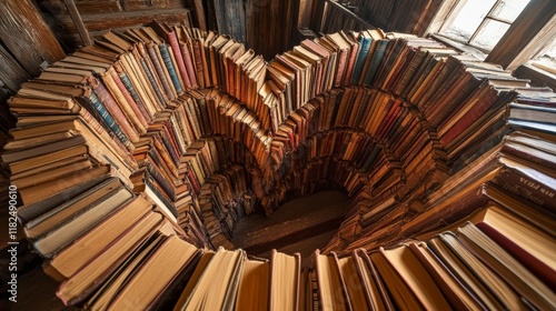 Opened books create a heart shape in a spiral arrangement for book lovers