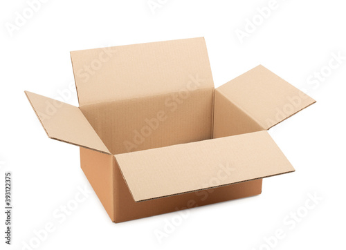 Opened cardboard box for storing goods and parcels by mail on a white isolated background.