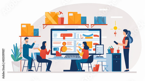 Open-plan office with employees around digital whiteboard, e-commerce icon visible.