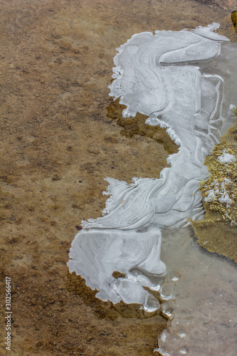 openwork crust of ice on the water. beautiful ice on a puddle close-up.