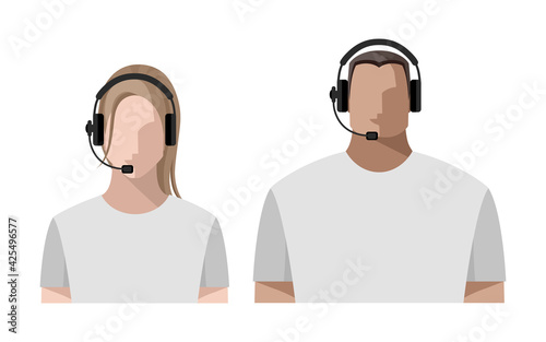 Operators are young men and women online, wearing headphones with a microphone, headset. Call center concept or support service. Color avatars, isolated vector illustrations
