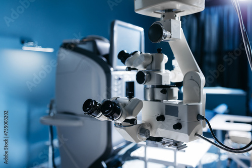 Ophthalmic laser system in eye surgery clinic. Laser treatmnet for myopia. The ophtalmology medical equipment. Eyes examination. Modern device. Laser eye vision correction