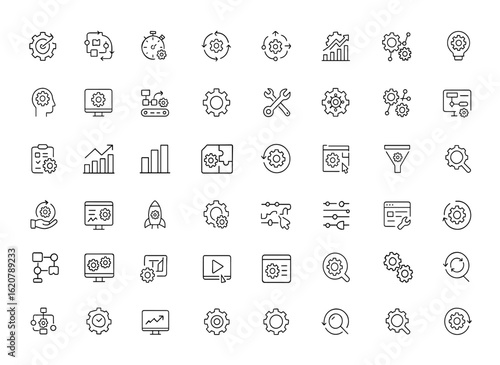 Optimized Workflow Processing Vector Line Icons Pack. Simple line art style illustration for business, engineering, automation, management, innovation, support, technology, and efficiency and more.