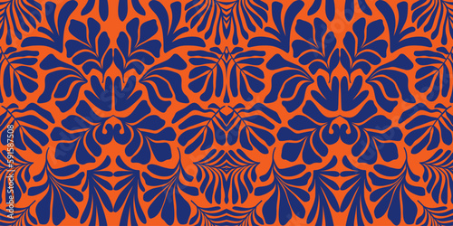 Orange blue abstract background with tropical palm leaves in Matisse style. Vector seamless pattern.