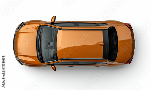 Orange car, overhead view, white background, studio shot, automotive advertising