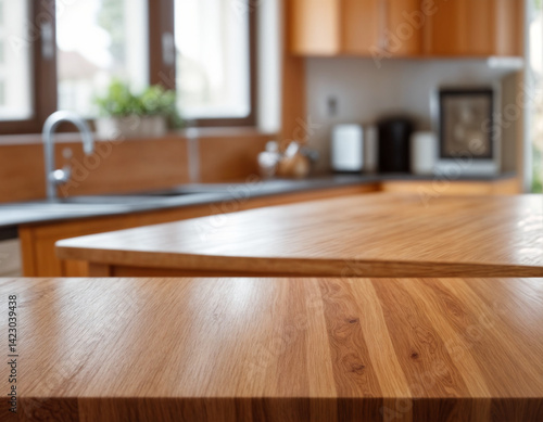 Orange Empty wooden table with the bright white interior minimal of the kitchen as a blurred background behind the bokeh golden sunshine