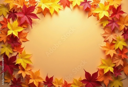 Orange fall background with frame of autumn yellow and golden maple leaves, template