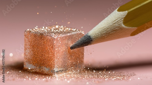 Orange Glitter Exploding from a Pencil in Pink Cube.