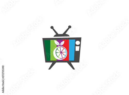 Orange half of a piece and Pulp with leaf for logo design illustration in a old tv shape colors icon