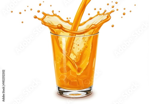 Orange juice being poured into a glass with ice cubes creating a splash on a white background