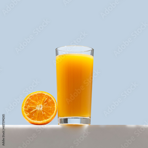 Orange juice. Glass of 100% Orange juice with orange, bottom-up view. Creative summer composition, refreshment concept.