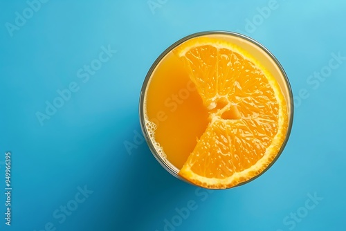 Orange juice in a glass with a slice of orange on a blue background
