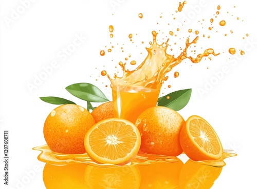 Orange juice splash with oranges isolated on a white background, PNG stock illustration