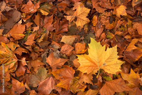 Orange leafs on the ground, in the autumn, photographed in Cologne, Germany. Picture made in 2009.