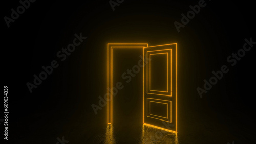 Orange neon open door with glowing lines. Cyberpunk neon door background concept. Glowing neon frame. Modern 3d graphic concept. 3D rendering