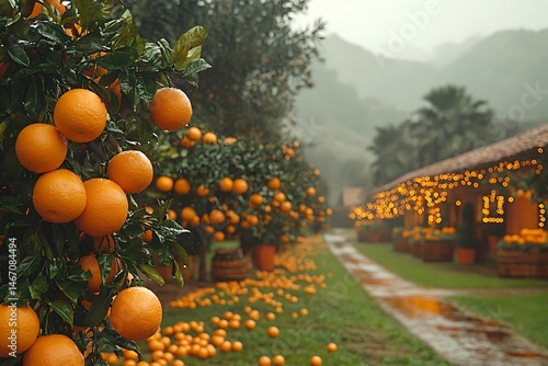 Orange orchard scene with lush trees fruit and pathway on a misty rainy day