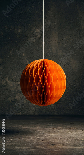 Orange paper honeycomb ball hanging from a string in a dark gray concrete setting. Decoration for a party or celebration, professional product styling in a modern, industrial space.