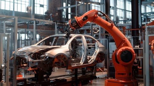 Orange Robotic Arm Assembling Silver Car Chassis in Industrial Facility