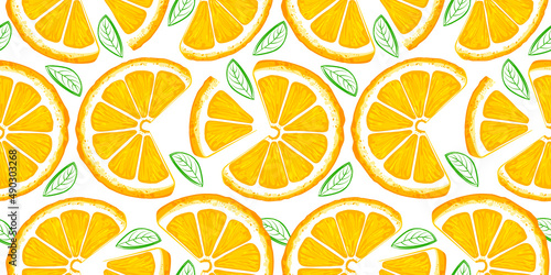 Orange seamless pattern. Colorful sketch lemons. Citrus fruit background. Elements for menu, greeting cards, wrapping paper, cosmetics packaging, posters etc