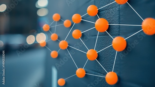 Orange spheres connected by lines form a network structure on a dark background, symbolizing connectivity and data.