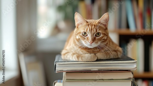 Orange tabby cat resting on stack of books Indoor, calm and relaxed