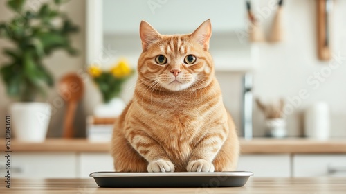 Orange tabby cat sits on kitchen scale. Adorable pet!