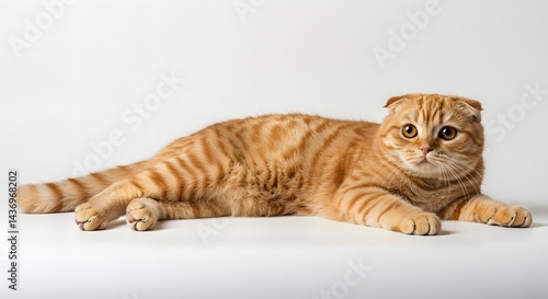 Orange tabby scottish fold cat lying down on a white surface looking directly at the camera shot in studio