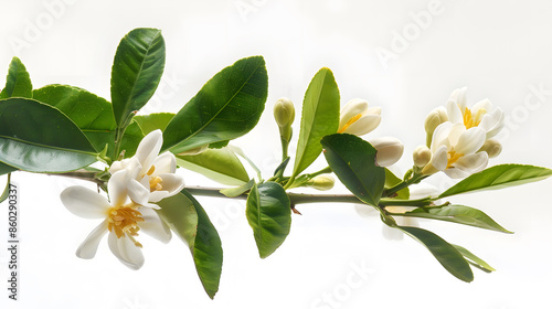 Orange tree branches with flowers buds and leaves isolated on white Neroli citrus white bloom : Generative AI