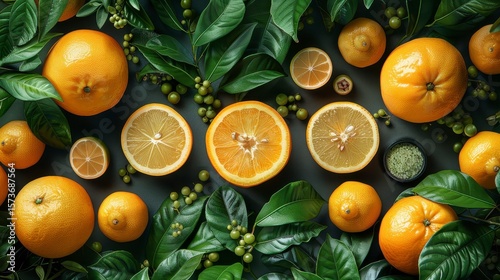 Oranges and lemons amidst lush green foliage on a dark surface, flat lay arrangement