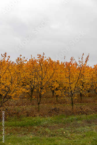 orchard with cherry during autumn leaf fall, cloudy weather in the orchard with cherries before winter