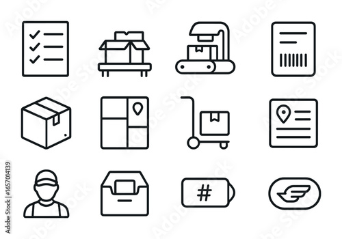 Order Fulfillment Icons. Outline icon set of order fulfillment process: pick list, packaging station, sealing
