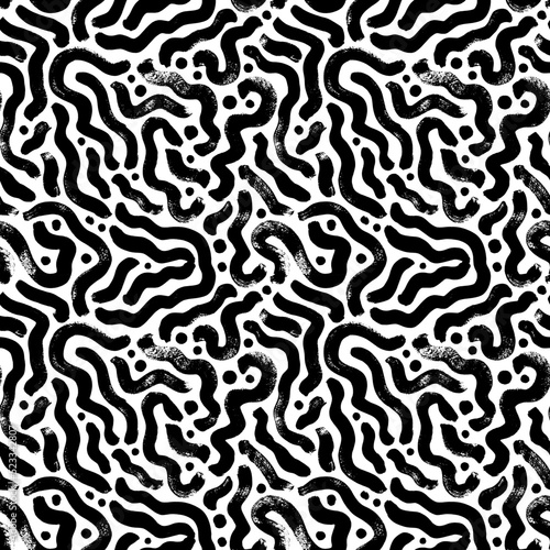 Organic curved lines and dots seamless pattern. Hand drawn irregular curved and wavy lines with grunge circles. Black and white organic rounded jumble maze. Stylish structure of bacterias and cells.