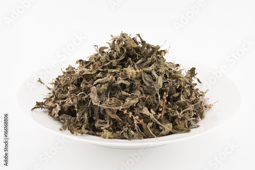 Organic dry Green or Holy Basil (Ocimum tenuiflorum) leaves on white background ,holy basil herb used in natural alternative herbal medicine