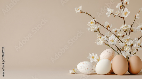 Organic free-range chicken eggs in soft pastel colors with fresh cherry blossoms, set on a beige background with natural sunlight, perfect for Easter-themed designs. Horizontal layout,ample copy space