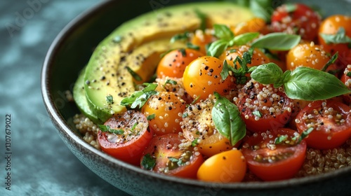 Organic quinoa salad with avocado, cherry tomatoes, and basil, macro top view. Concept of healthy eating, health