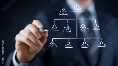Organization chart, mind map. Businessman uses a pen to draw an organigram on a virtual screen. HR Manager works on HR company structure tree diagram