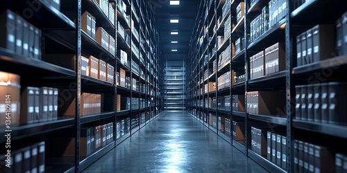 Organized Archive with Rows of Metal Shelves and Document Binders in a Modern Storage Facility Illuminated by Warm Light