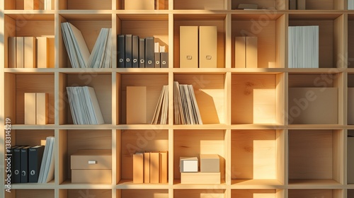 Organized books and folders on a shelf, showcasing simplicity and order in a minimalist workspace