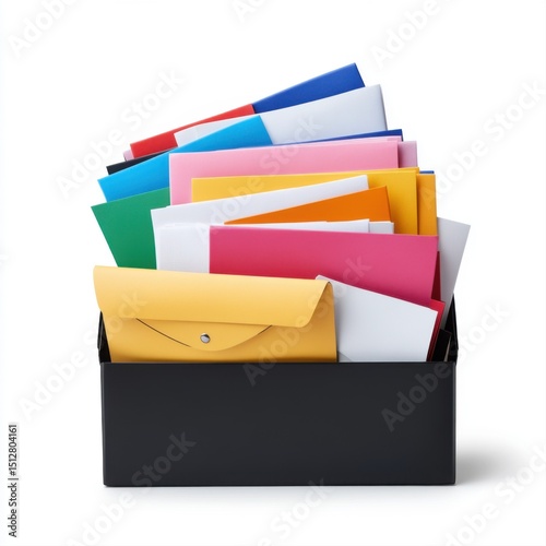 Organized Collection of Colorful Envelopes in a Black Document Box