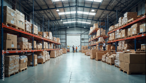 Organized warehouse with stacked boxes, high ceilings, and ample lighting.