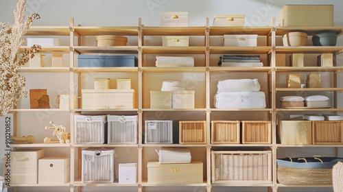 Organized wooden shelves filled with neatly arranged baskets, boxes, and containers, exuding a sense of minimalist and clean storage solutions.